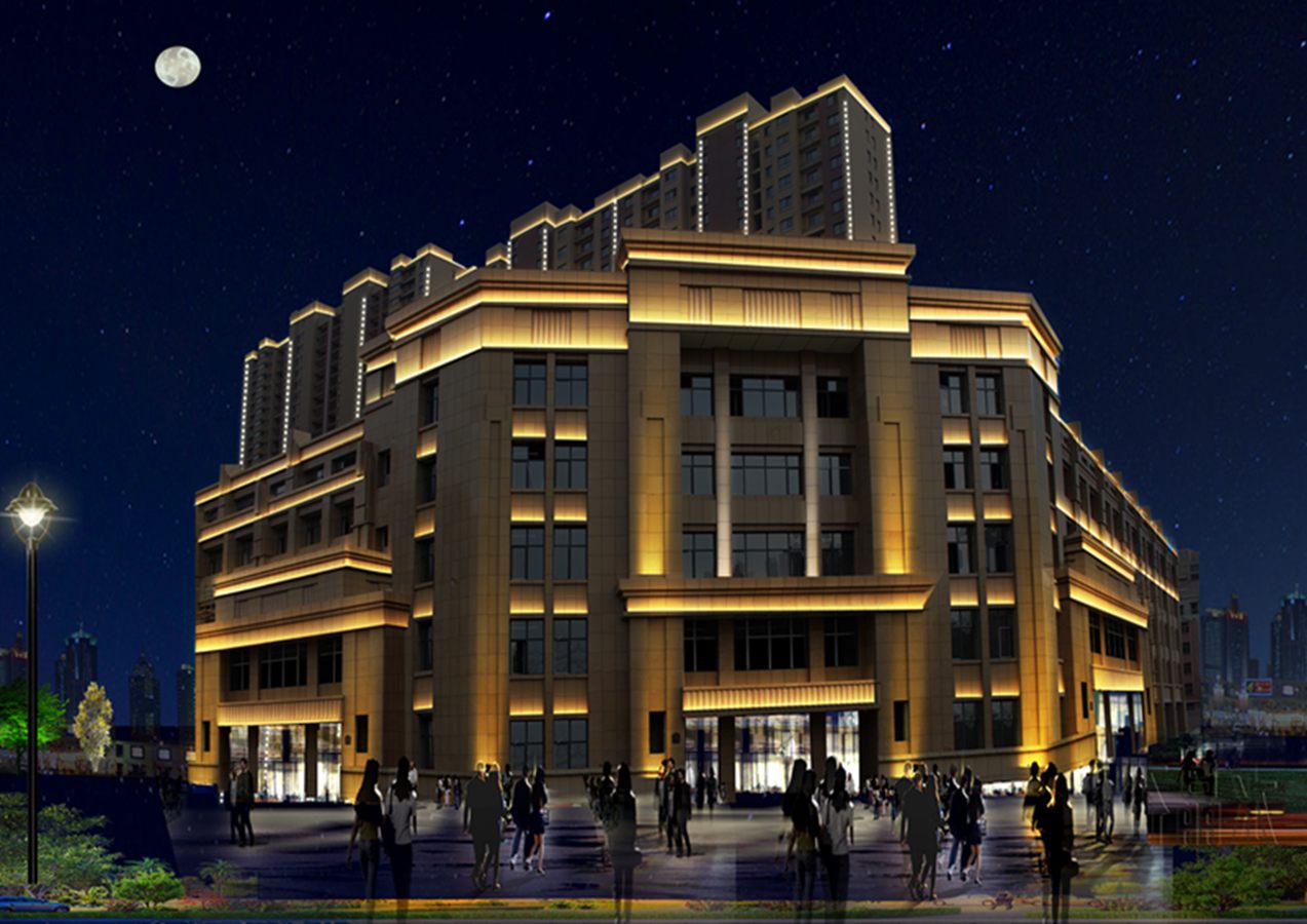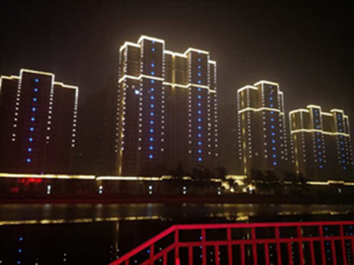 金河湾小区紧挨护城河,整体构思以“黑夜的星空”为主,突出顶部轮廓,体现整体布局,主要以点光源作为点缀,使楼体呈现出闪闪发光的视觉体验,水中倒映着,更别有一番意境。