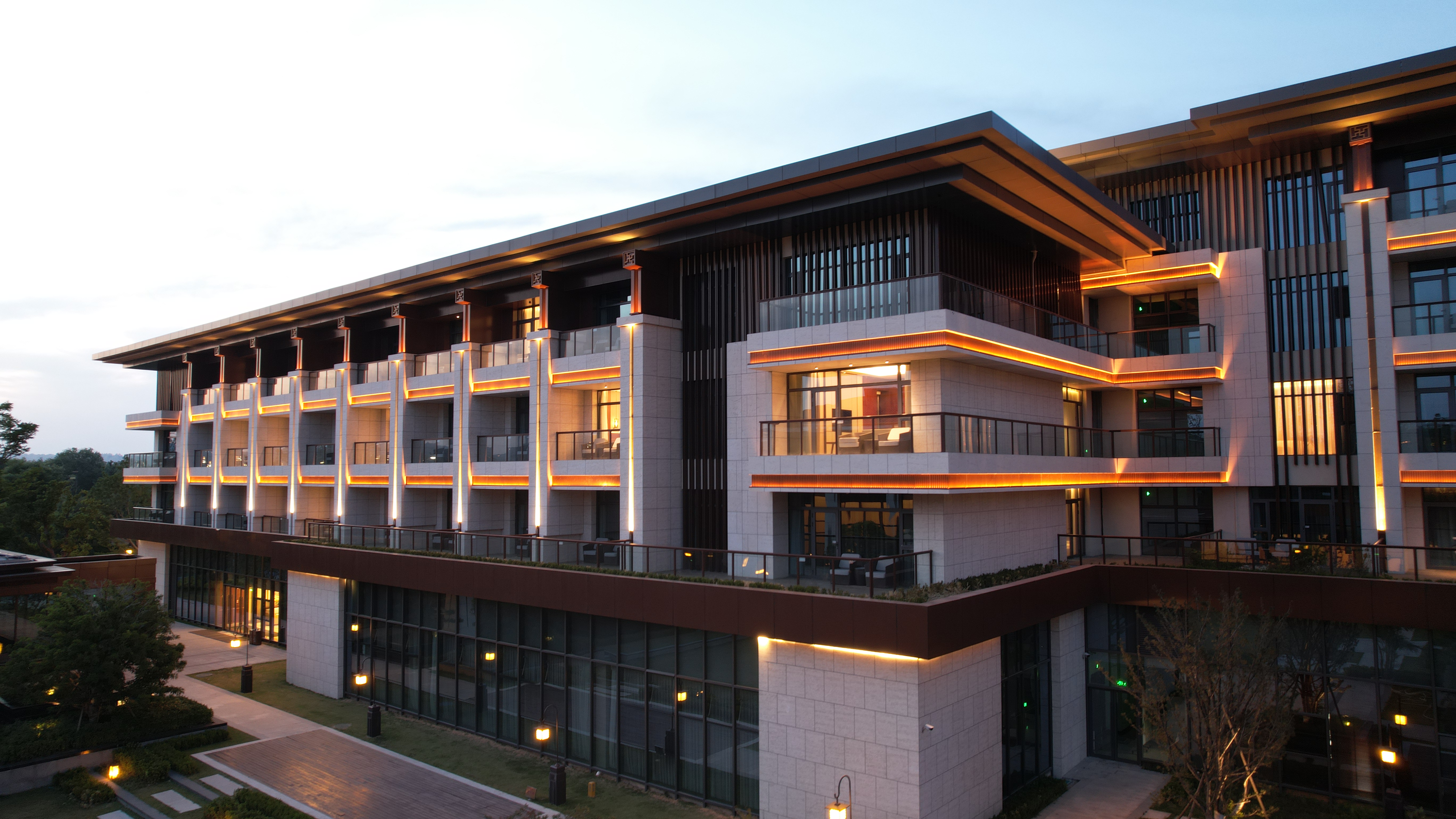 伊水迎宾馆以北魏洛阳皇家林园—华林园为设计灵感来源,遵循自然山水意境设计风格,打造优美的低密度的园林式酒店。酒店主体建筑材料以暖灰色铝板,米黄色石材为主,造型上通过实木构架及隔栅,打造古香古色、独具韵味的建筑空间,尽显洛阳名城的深厚文化底蕴。建筑泛光照明采用间接光的照明方式,以局部投光和光影交融的手法,依据建筑平面布局及立面展示条件进行差异化照明。灯光重点表现外立面温和明快的米黄色材料为主,搭配砖红,砖黄及灰白色,延承洛阳城市主色调和文化厚重感,灯光做到“见光不见灯”时灯具尽可能隐蔽安装。灯光表现建筑顶部、外立面,窗间墙内透灯光,建筑造型简洁内敛,细节处彰显建筑品质。在业主单位、设计单位和施工单位的共同努力下,完成了对整体泛光照明项目的验收工作,赢得了各级领导及相关配合单位的认可,为城市增添了一抹亮丽的色彩。